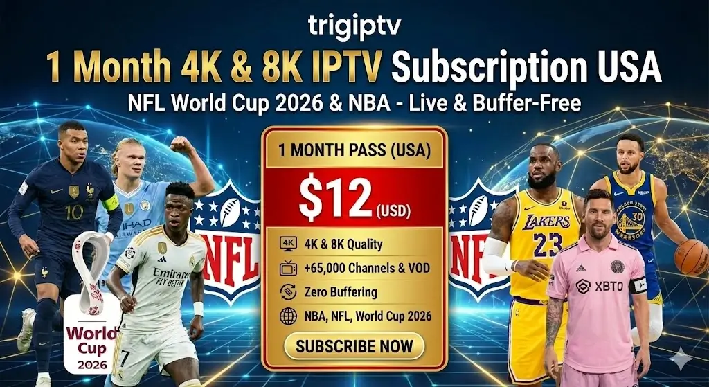 Looking for the best IPTV for sports USA that won’t let you down during the game-winning touchdown? This 1 month 4K & 8K IPTV subscription USA is your low-risk test drive before World Cup 2026 kicks off in North America. For just $12, experience NFL streaming in 4K & 8K, Champions League, MLS with Messi, and over 47,000 channels—all powered by our IPTV no buffering Anti-Freeze 9.0 technology.